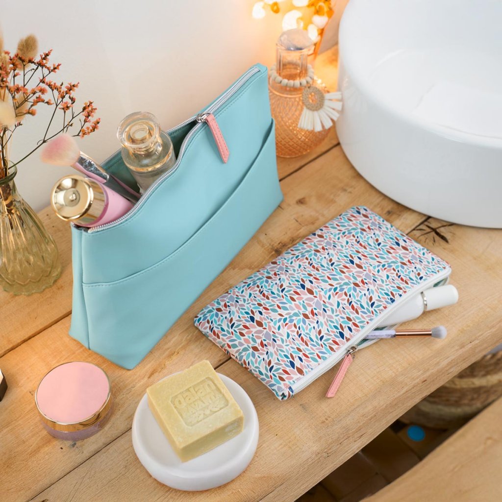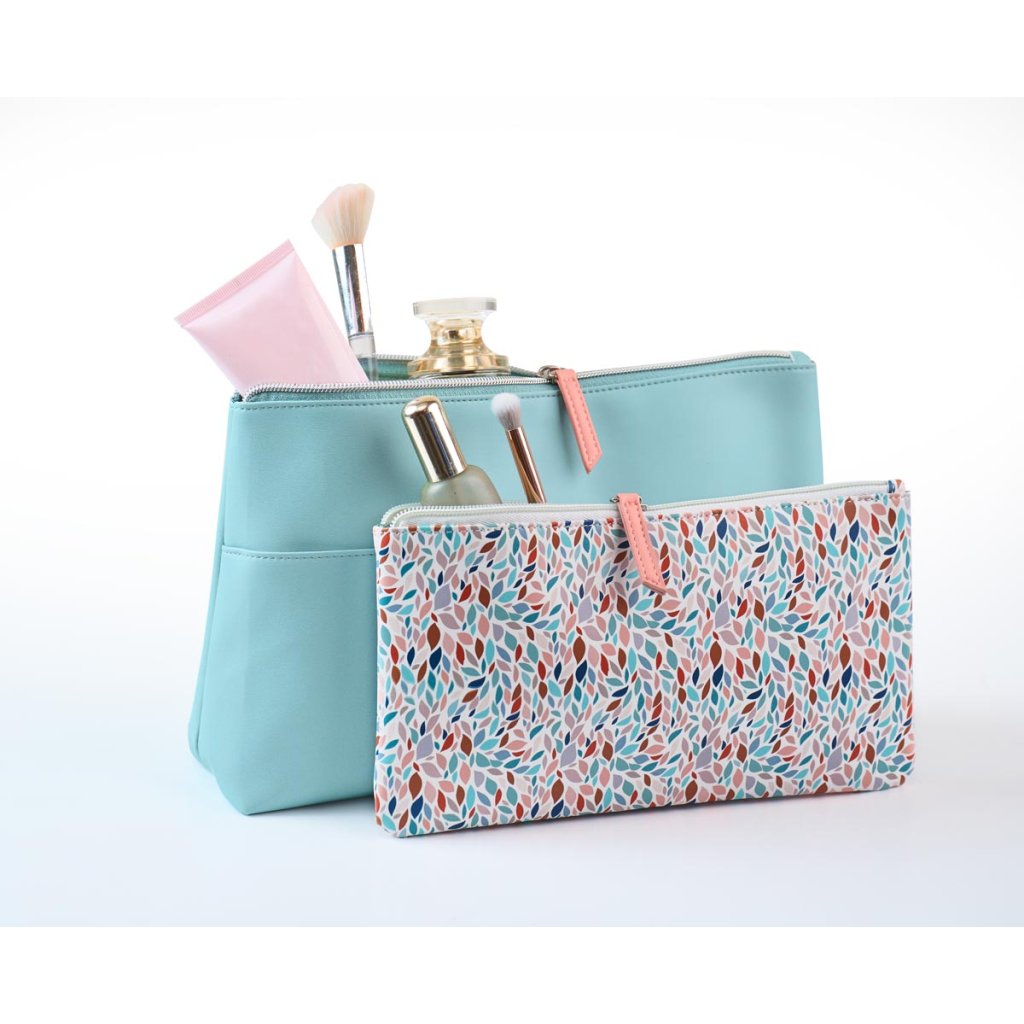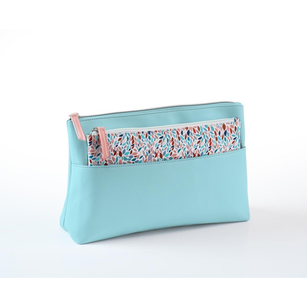 Veľká kozmetická taška v jemnej zelenej farbe s vnútorným vreckom + ďalšia taška. Obe so zapínaním na zips. PVC. Vnútorná podšívka: 100% polyester. Rozmery 1. vrecka: 29 x 18 x 7,5 cm. Rozmery 2. vrecúška: 25 x 13 cm.