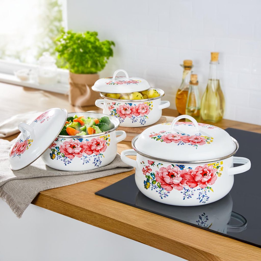 Tieto smaltované hrnce s bohatými kvetinovými motívmi evokujú radosť z letného varenia a sú prísľubom kulinárskych dobrodružstiev. A čo je najlepšie - môžete v nich hneď servírovať svoje obľúbené jedlá.