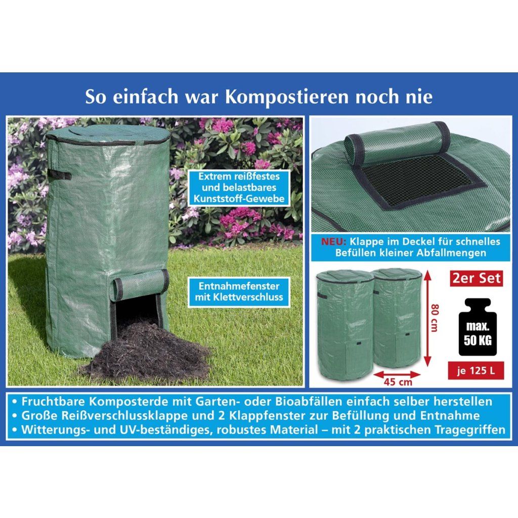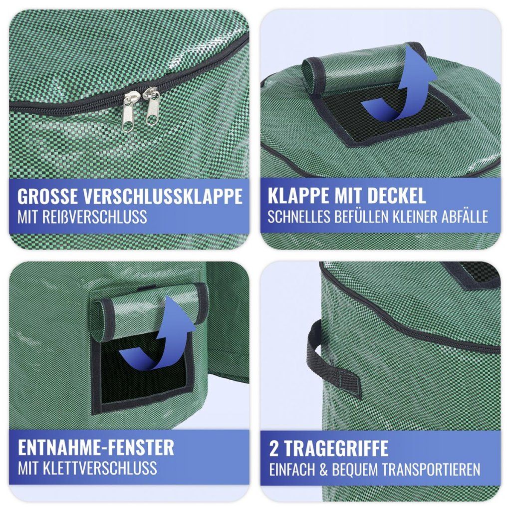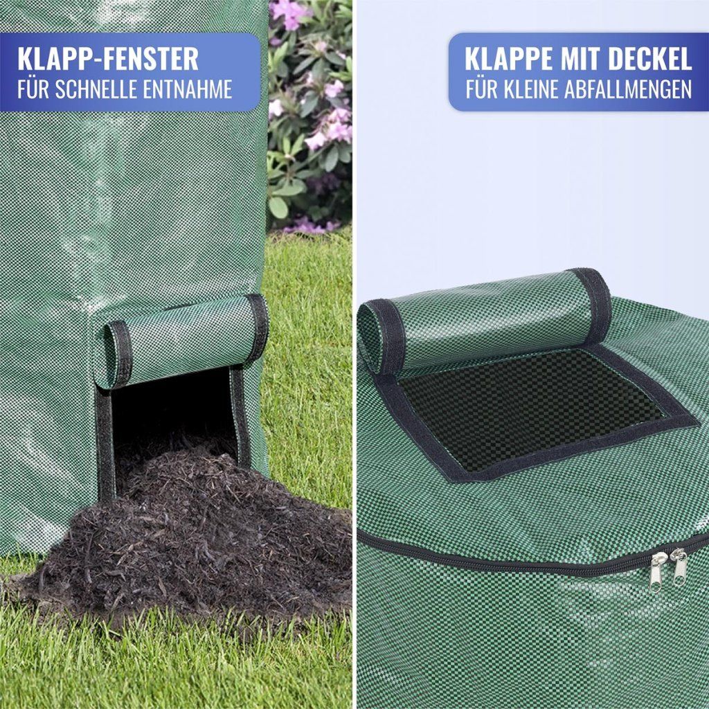 Veľký plniaci otvor na zips a prídavné veko na suchý zips umožňujú veľmi pohodlnú manipuláciu s odpadom. V spodnej časti sa nachádza praktické okienko na jednoduché vyberanie hotového kompostu, zatiaľ čo robustné rukoväte uľahčujú jeho prenášanie.