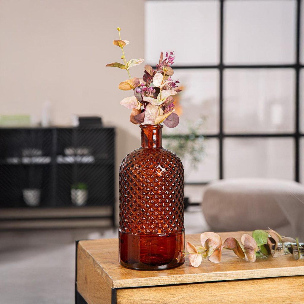 Elegantná sklenená váza Diamond v teplom hnedom tóne je štýlovým doplnkom každého interiéru. Vďaka jedinečnej diamantovej štruktúre povrchu, ktorá nádherne odráža svetlo, pôsobí ako umelecký dekoratívny prvok. Váza je vhodná na výrazné aranžmány aj ako samostatný dizajnový kúsok.