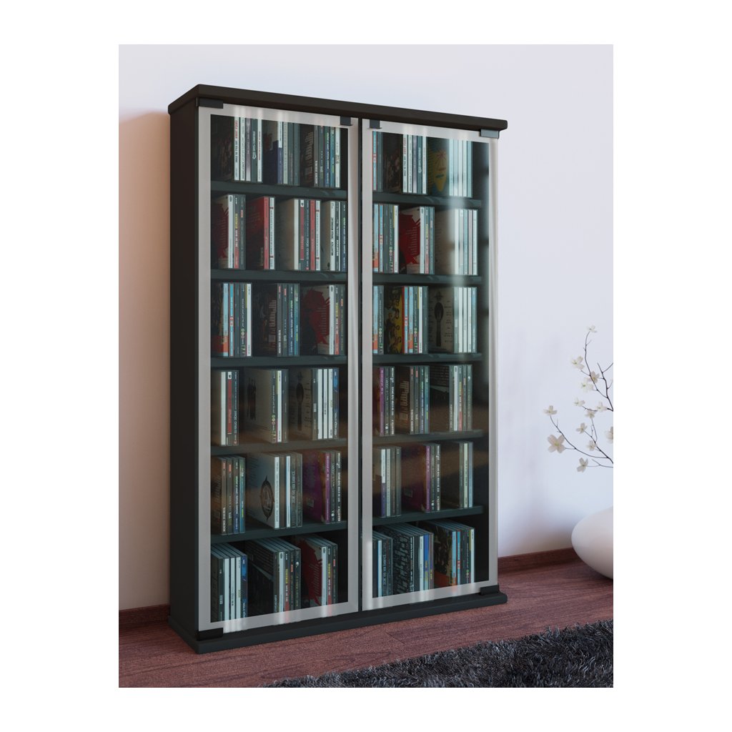 Praktická skrinka Gallery na ukladanie CD, DVD alebo VHS s dvomi dvierkami z bezpečnostného skla s ozdobným matným okrajom.