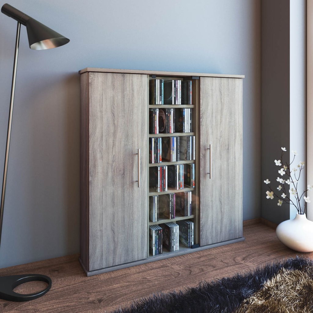 Skrinka Santo ponúka bezpečný priestor pre vaše obľúbené zbierky, najmä CD a DVD (kapacita 450 CD, 195 DVD alebo 108 VHS). Všetko bude uložené v bezprašnom prostredí vďaka dvom dreveným dvierkam a jednému sklenenému v strede. Má 15 variabilných políc.