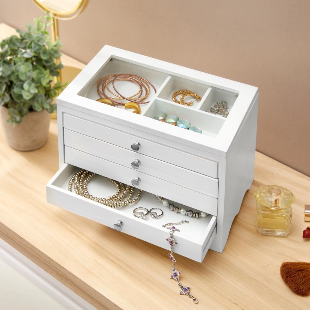 Elegantná šperkovnica veľká ponúka bezpečné a štýlové uchovávanie šperkov a iných módnych doplnkov. Tri priestranné zásuvky poskytujú dostatok miesta na náhrdelníky, prstene, náušnice a hodinky. Táto praktická šperkovnica slúži ako prehľadný organizér šperkov do spálne alebo šatne. Dodáva sa bez obsahu.