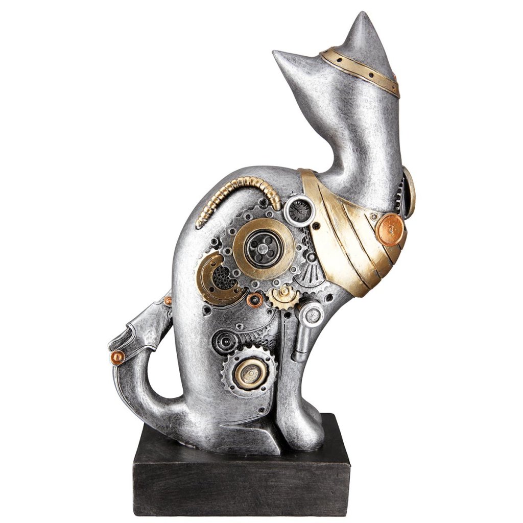 Originálna socha Steampunk Cat je štýlovou interiérovou dekoráciou v starožitnom striebornom odtieni s výraznými medenými detailmi. Elegantná mačka na podstavci zaujme industriálnym steampunkovým dizajnom a stane sa neprehliadnuteľným doplnkom každého moderného a kreatívneho interiéru.
