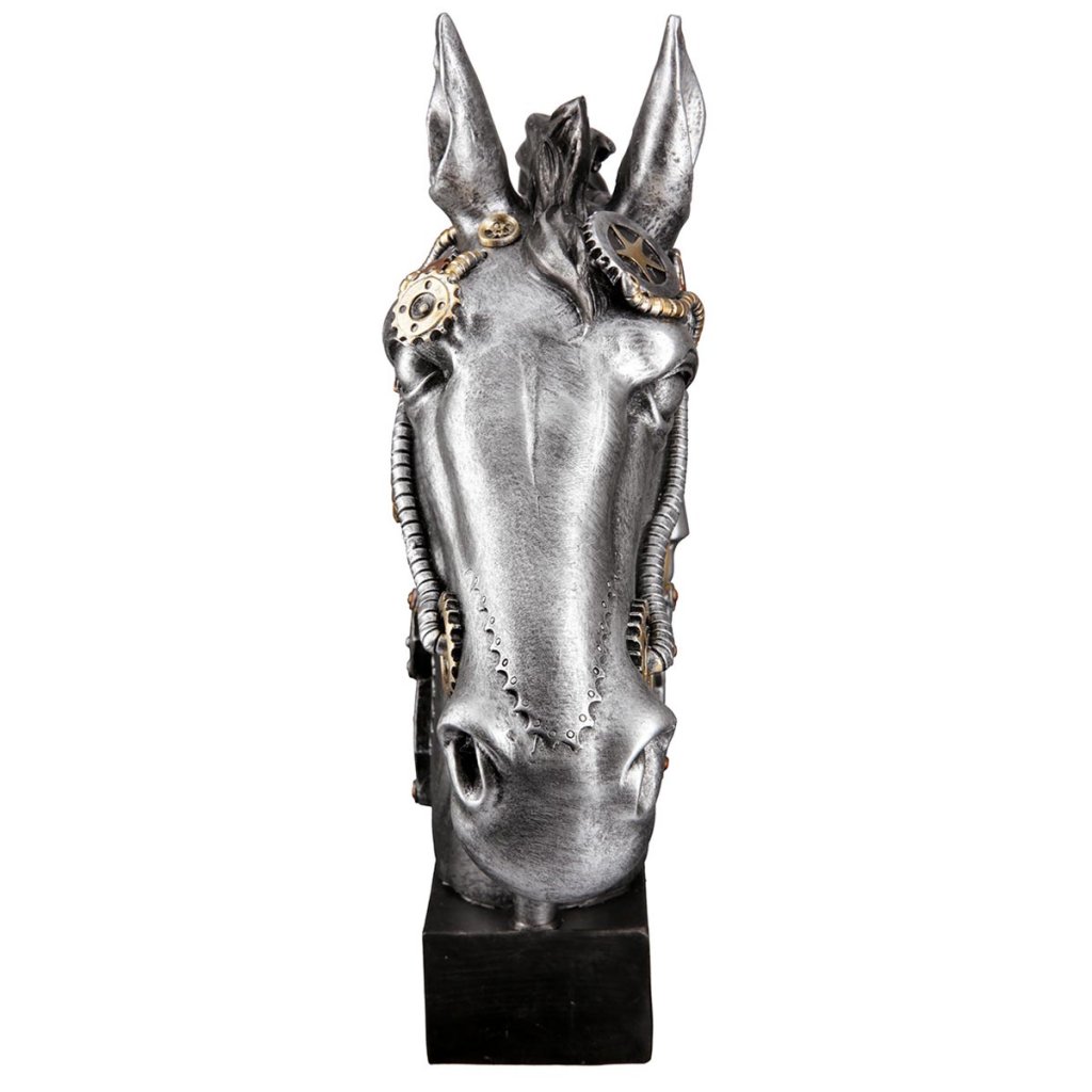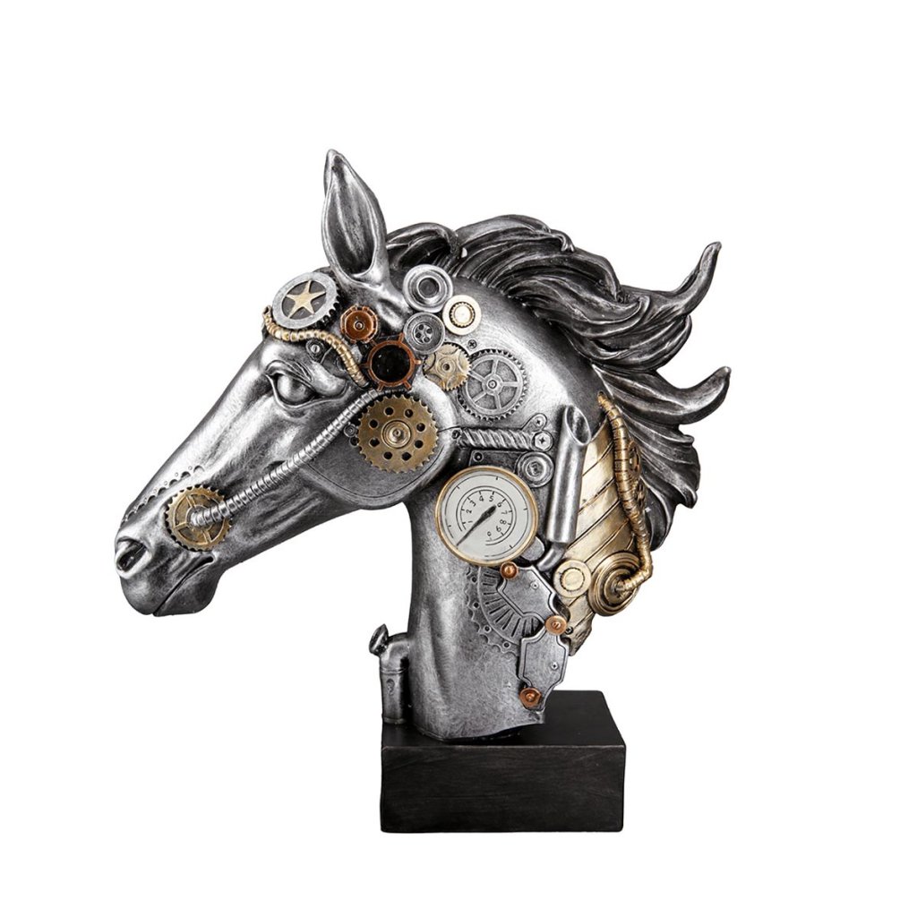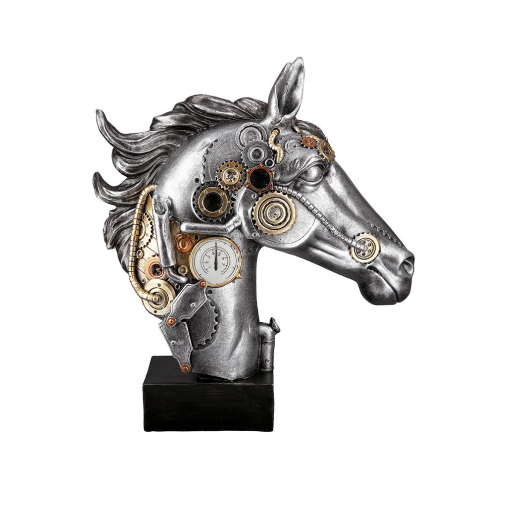 Táto moderná soška zobrazuje úžasného koňa v striebornej farbe so zlatými a medenými prvkami. Steampunkové dekoratívne sošky v duchu Julesa Verna vyniknú v každom interiéri. Sú však aj skvelým darčekom pre milovníkov moderných dekorácií, či už k narodeninám alebo do nového domova.Dodatočné parametre