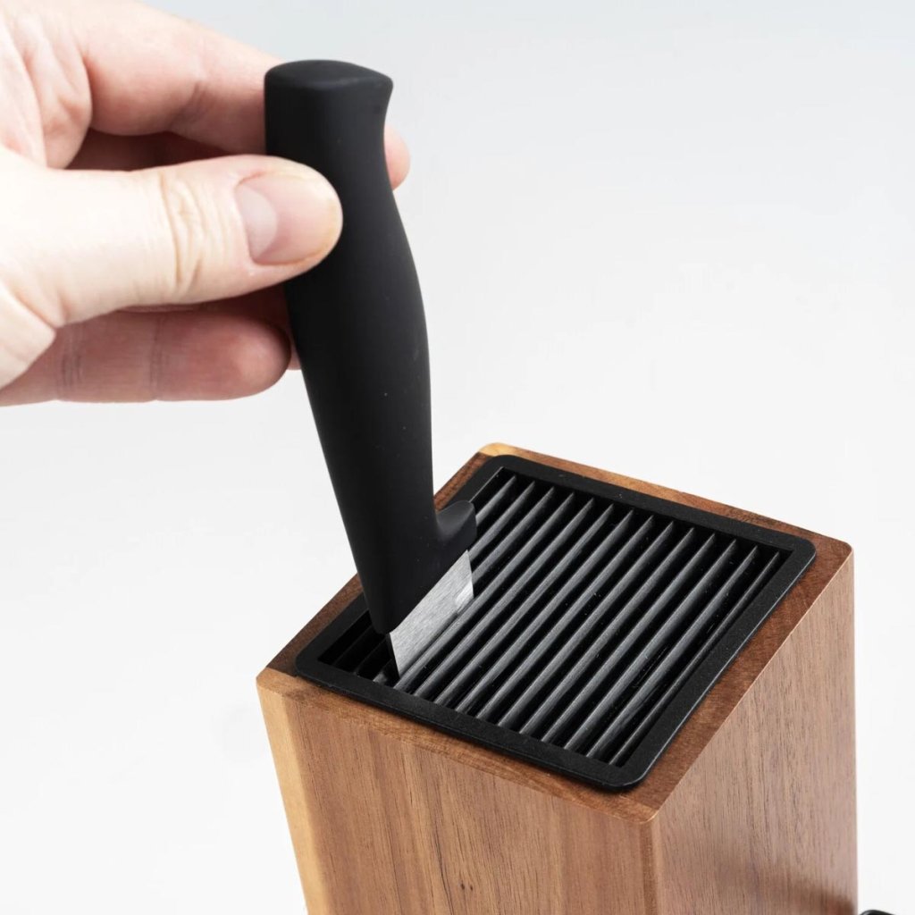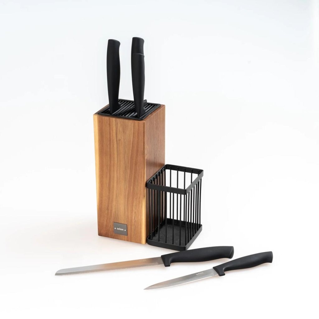 Elegantný stojan na kuchynské potreby a sadu nožov je praktickým a štýlovým doplnkom každej kuchyne. Nadčasový dizajn kombinuje akáciové drevo, kov a vysokokvalitnú nehrdzavejúcu oceľ, vďaka čomu je moderný a zároveň vysoko odolný. Stojan sa dodáva s piatimi kuchynskými nožmi rôznych veľkostí, ktoré sú uložené v gumovej vložke v drevenej časti - nože sa tak uložením v zásuvke zbytočne netupia.