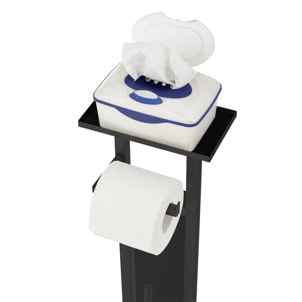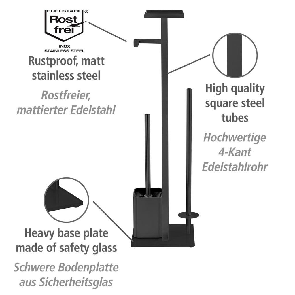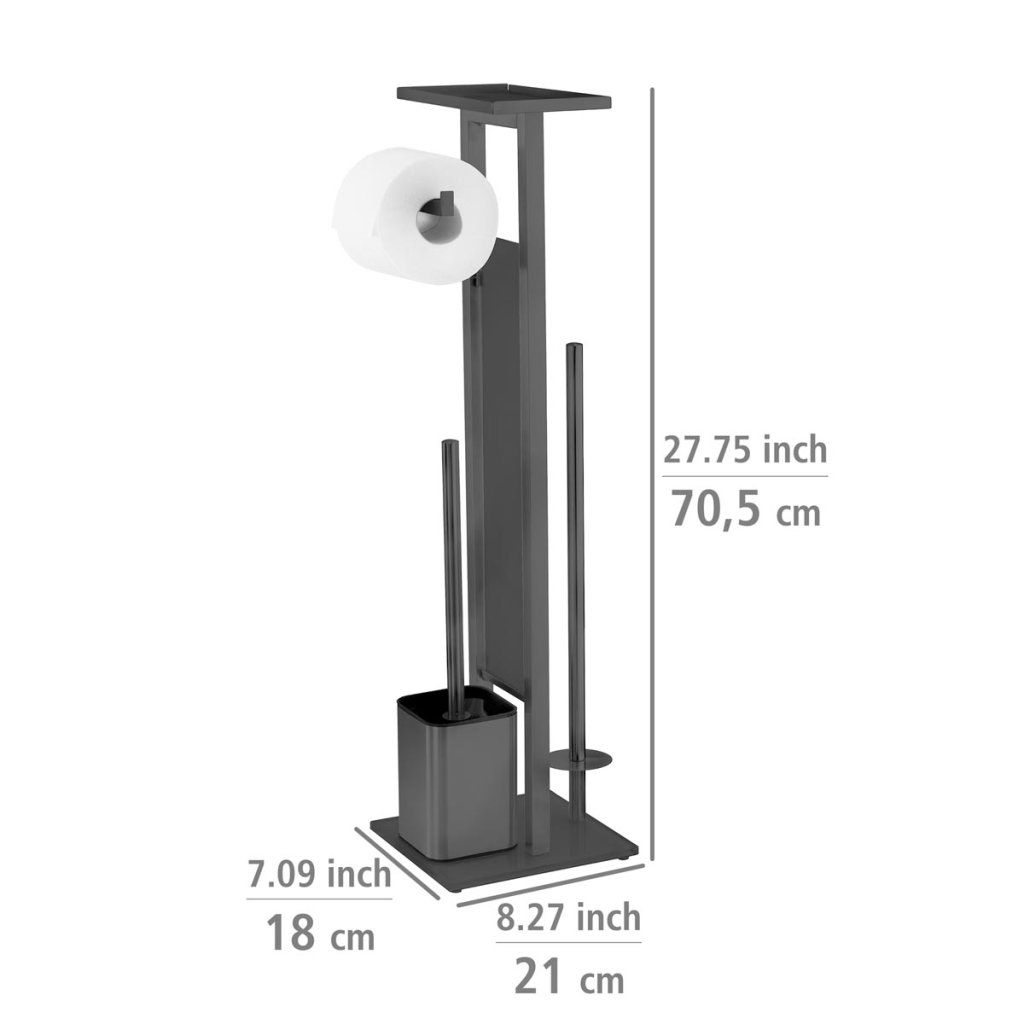 Stojan na WC ponúka držiak na toaletný papier, zásobník až na 3 náhradné rolky, otvorený držiak na WC kefu a praktický odkladací priestor na vlhčené utierky, kúpeľňové doplnky alebo mobilný telefón. Stabilná základňa z čierneho bezpečnostného skla zaisťuje bezpečnú polohu. Súčasťou balenia je aj WC kefa s vymeniteľnou hlavicou s priemerom 8,5 cm na dôkladné a hygienické čistenie.