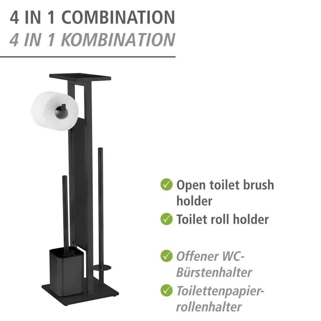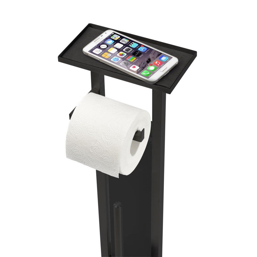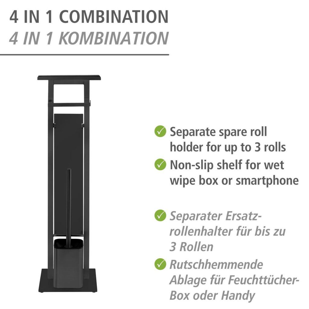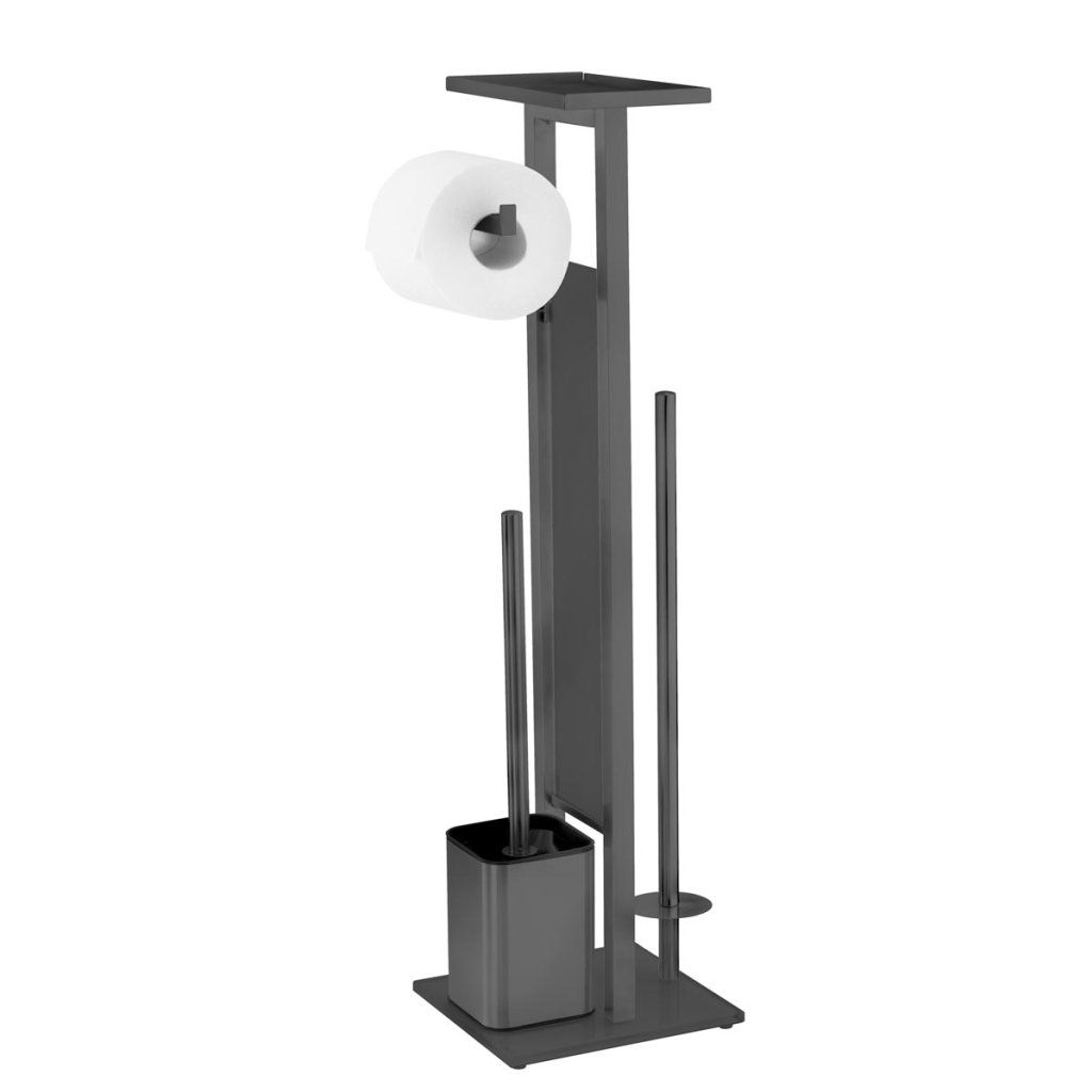 Stojan na WC ponúka držiak na toaletný papier, zásobník až na 3 náhradné rolky, otvorený držiak na WC kefu a praktický odkladací priestor na vlhčené utierky, kúpeľňové doplnky alebo mobilný telefón. Stabilná základňa z čierneho bezpečnostného skla zaisťuje bezpečnú polohu. Súčasťou balenia je aj WC kefa s vymeniteľnou hlavicou s priemerom 8,5 cm na dôkladné a hygienické čistenie.