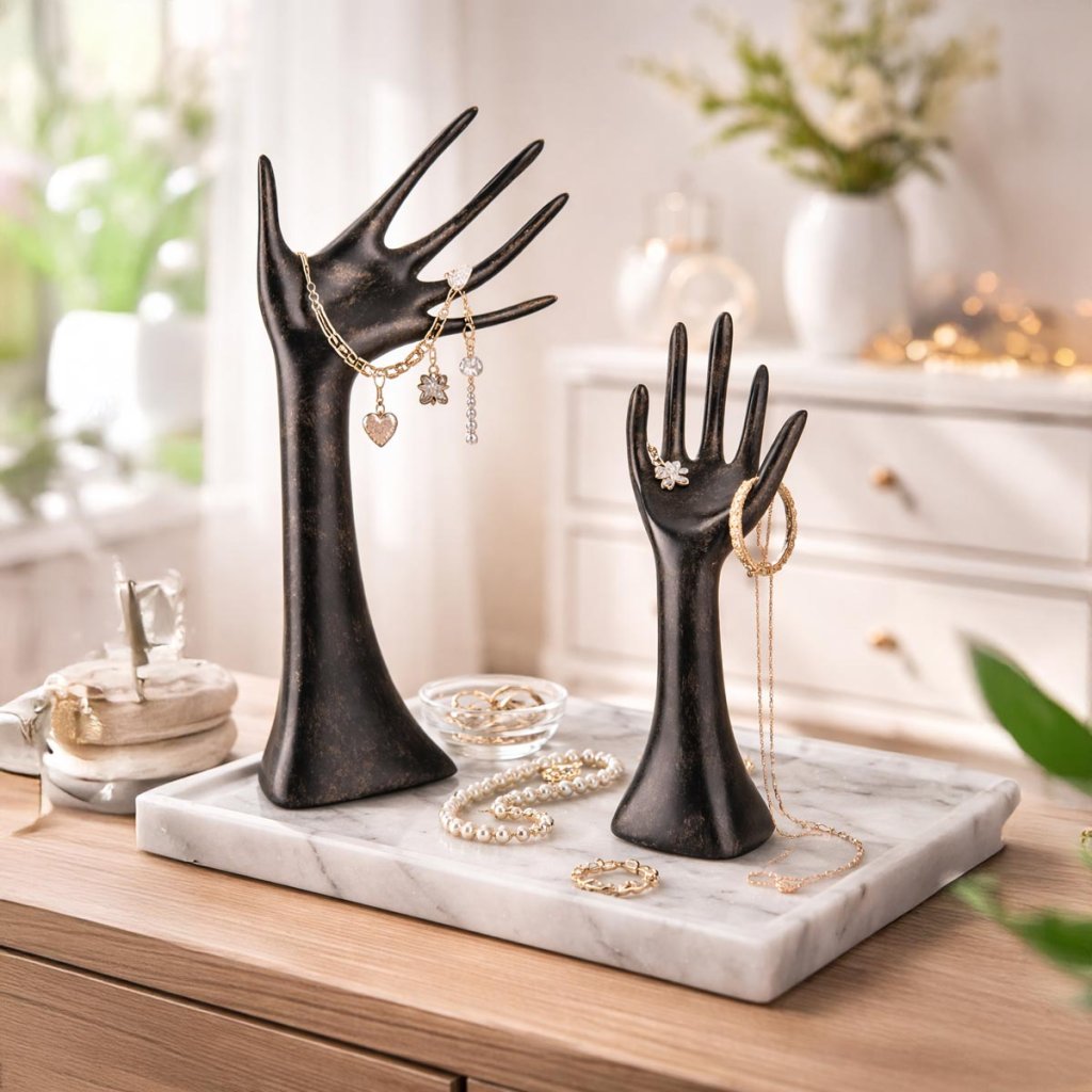Stojany sú vyrobené z kvalitnej živice v nadčasovej čiernej farbe s hladkým povrchom. Dokonale sa hodia do spálne, šatne a kúpeľne a vďaka súprave dvoch kusov umožňujú vytvoriť symetrickú dekoráciu alebo rozdeliť šperky podľa typu. Ideálne aj ako originálny darček.