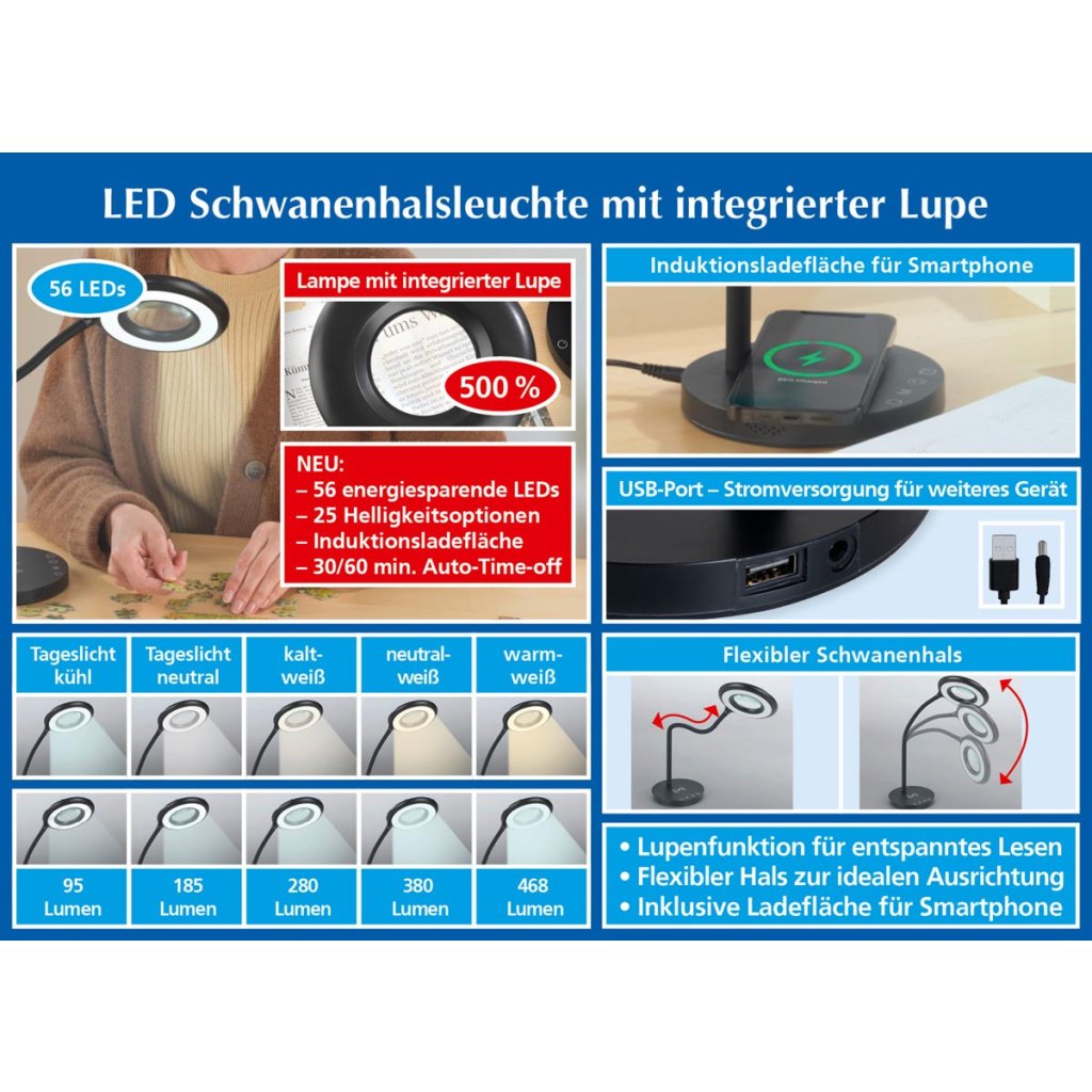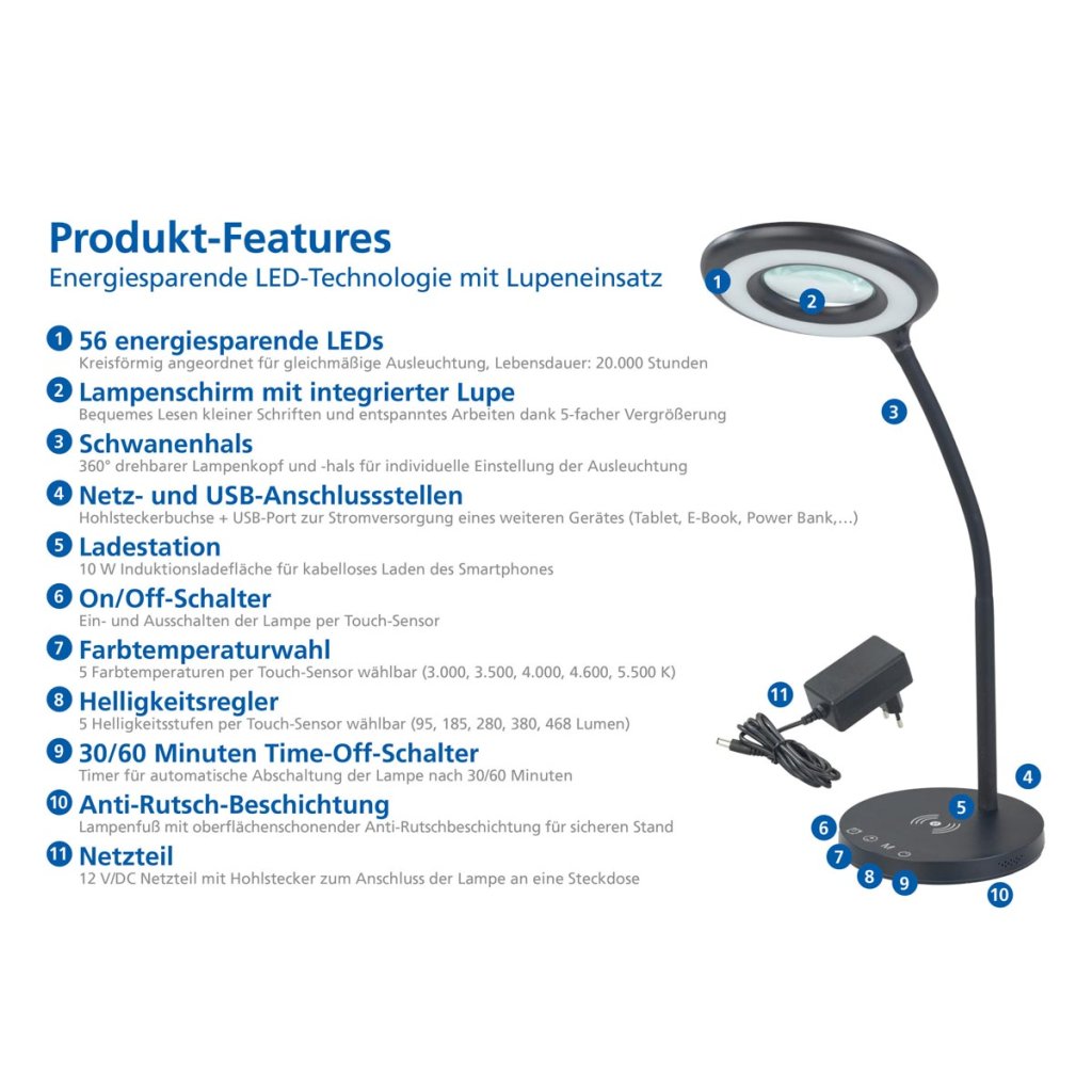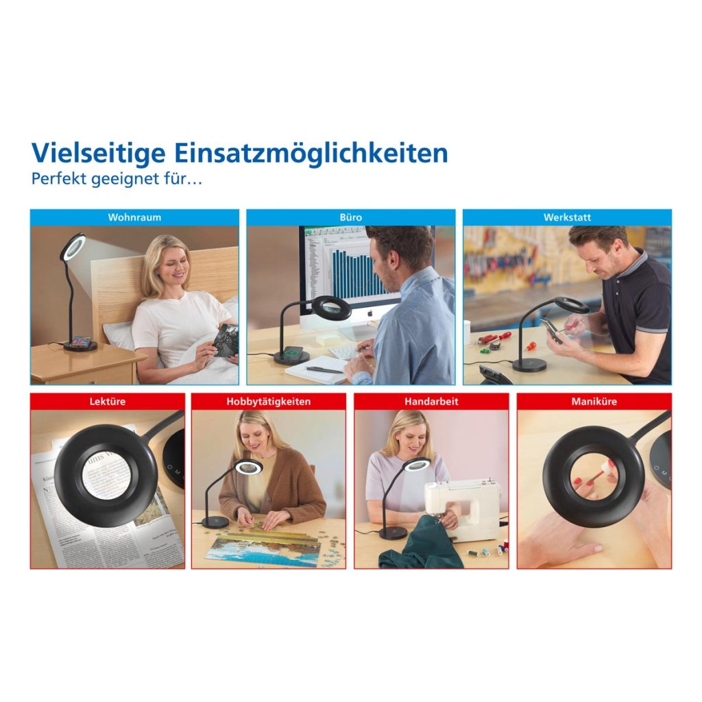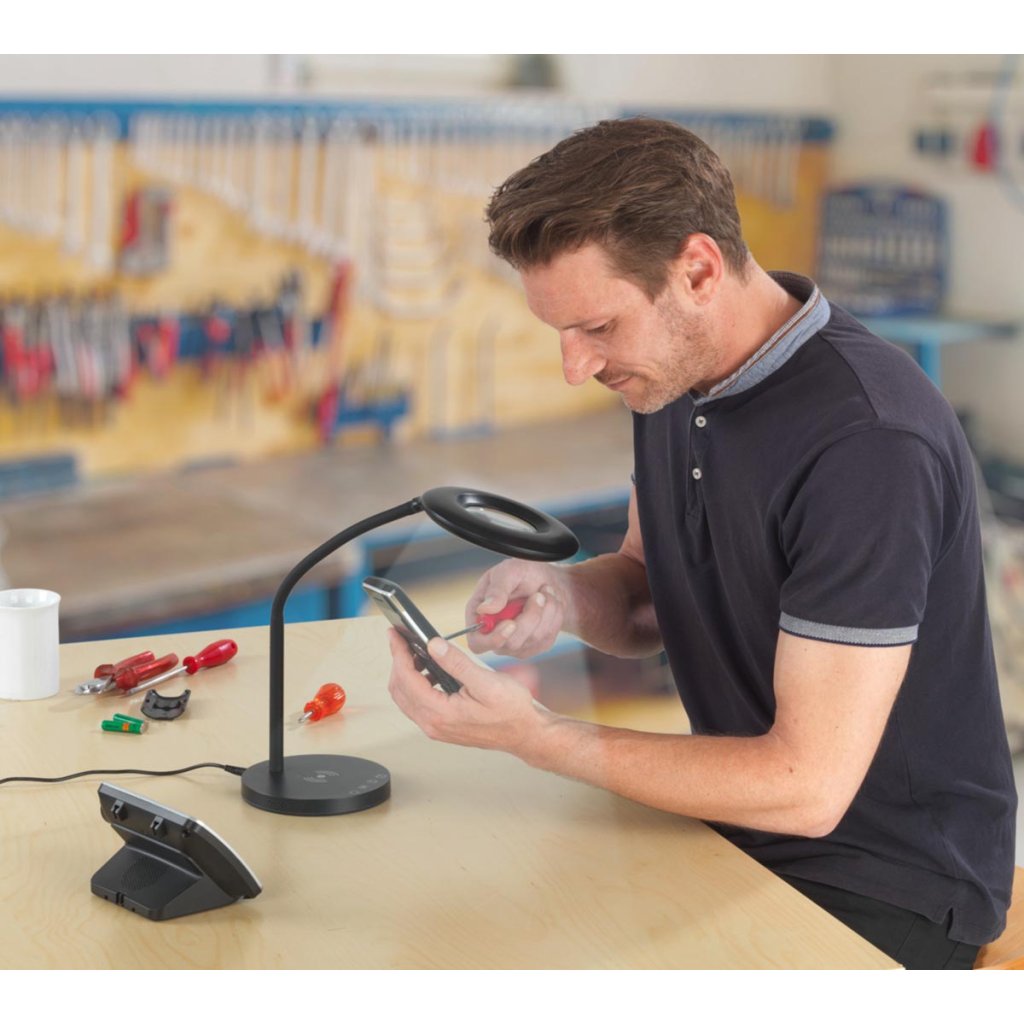 Táto moderná nočná lampa je dokonalou kombináciou pohodlného, neúnavného osvetlenia a praktických funkcií na každodenné použitie. Integrovaná lupa s 5-násobným zväčšením vám umožní pohodlne čítať drobný text a vykonávať detailné úlohy, ako sú opravy, ručné práce alebo výroba modelov.