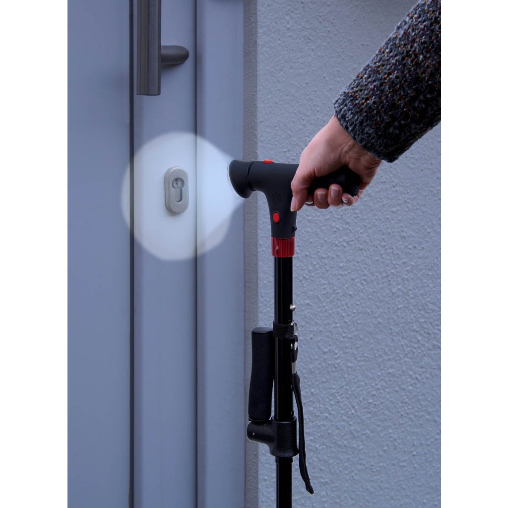 Táto praktická palica vám poskytne pohodlie nielen pri chôdzi, ale aj pri vstávaní a sedení. Vďaka štvorbodovej základni je veľmi stabilná. S integrovaným LED svetlom a funkciou alarmu so signálnym tónom a červeným blikajúcim svetlom. Skladacia rukoväť šetrí miesto. Nastaviteľná výška v 5 polohách 86 - 98 cm.