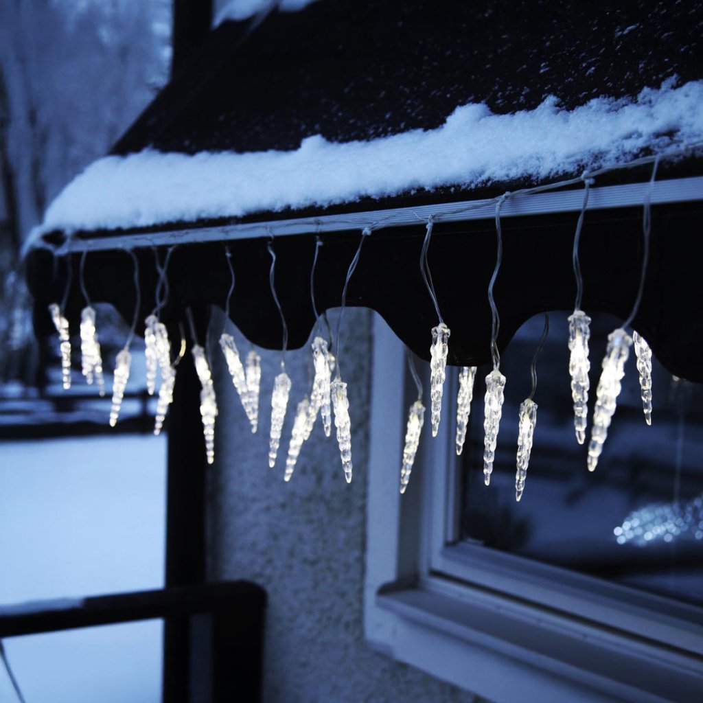 Svetelné rampúchy premenia váš dom na vianočný ľadový palác. 40 priehľadných rampúšov, z ktorých každý je osvetlený studenou bielou LED diódou, môžete umiestniť do štítu domu, na balkón alebo aj do interiéru.
