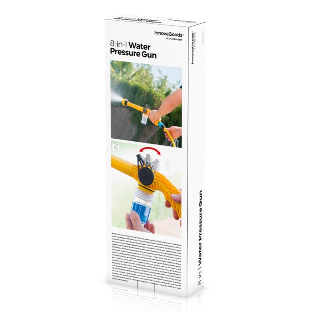 Vďaka tlaku vody a integrovanej nádržke na mydlo je umývacia pištoľ ideálna na čistenie stien, podláh, áut, okien atď. Okrem toho je ideálna aj na zavlažovanie rastlín alebo trávnikov a nádržku možno naplniť insekticídmi alebo hnojivami. Veľmi ľahko sa používa, rýchlo a jednoducho sa pripája k akejkoľvek hadici a umožňuje regulovať tlak vody.