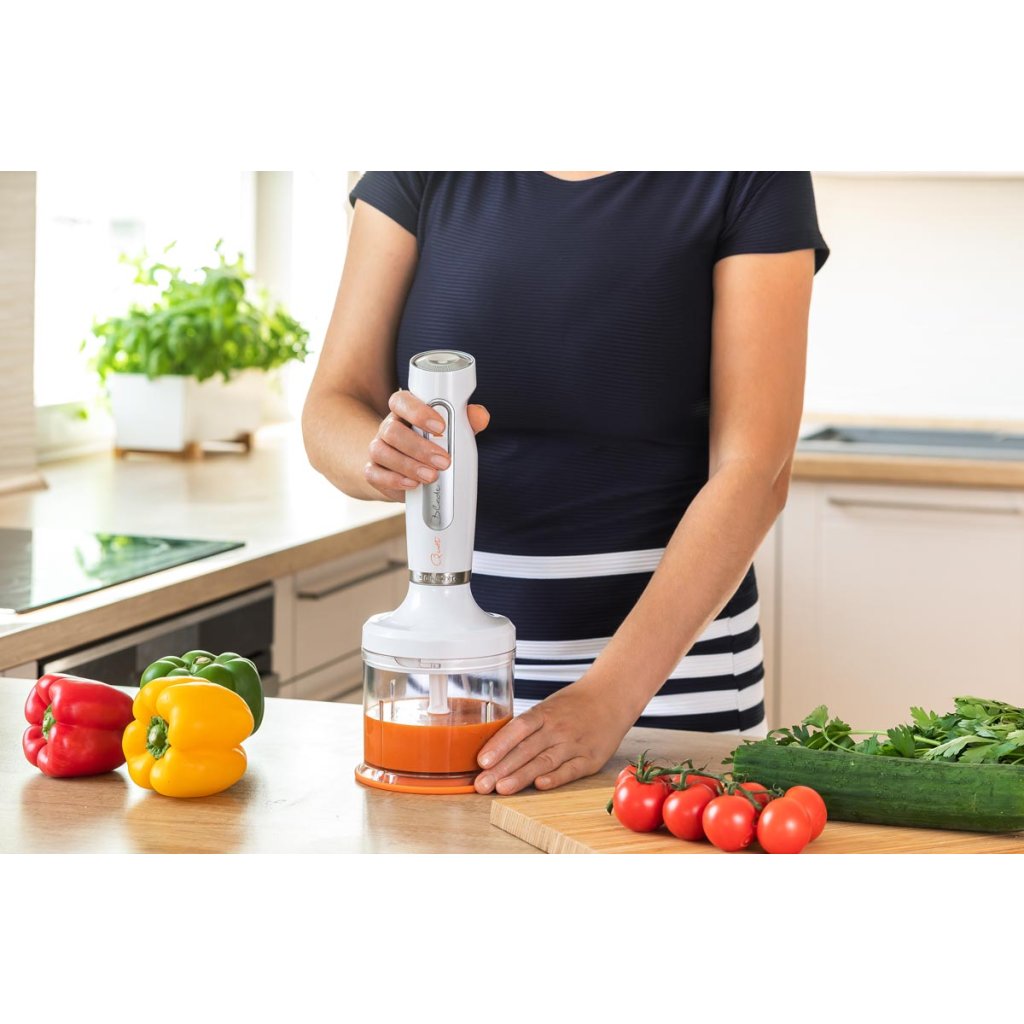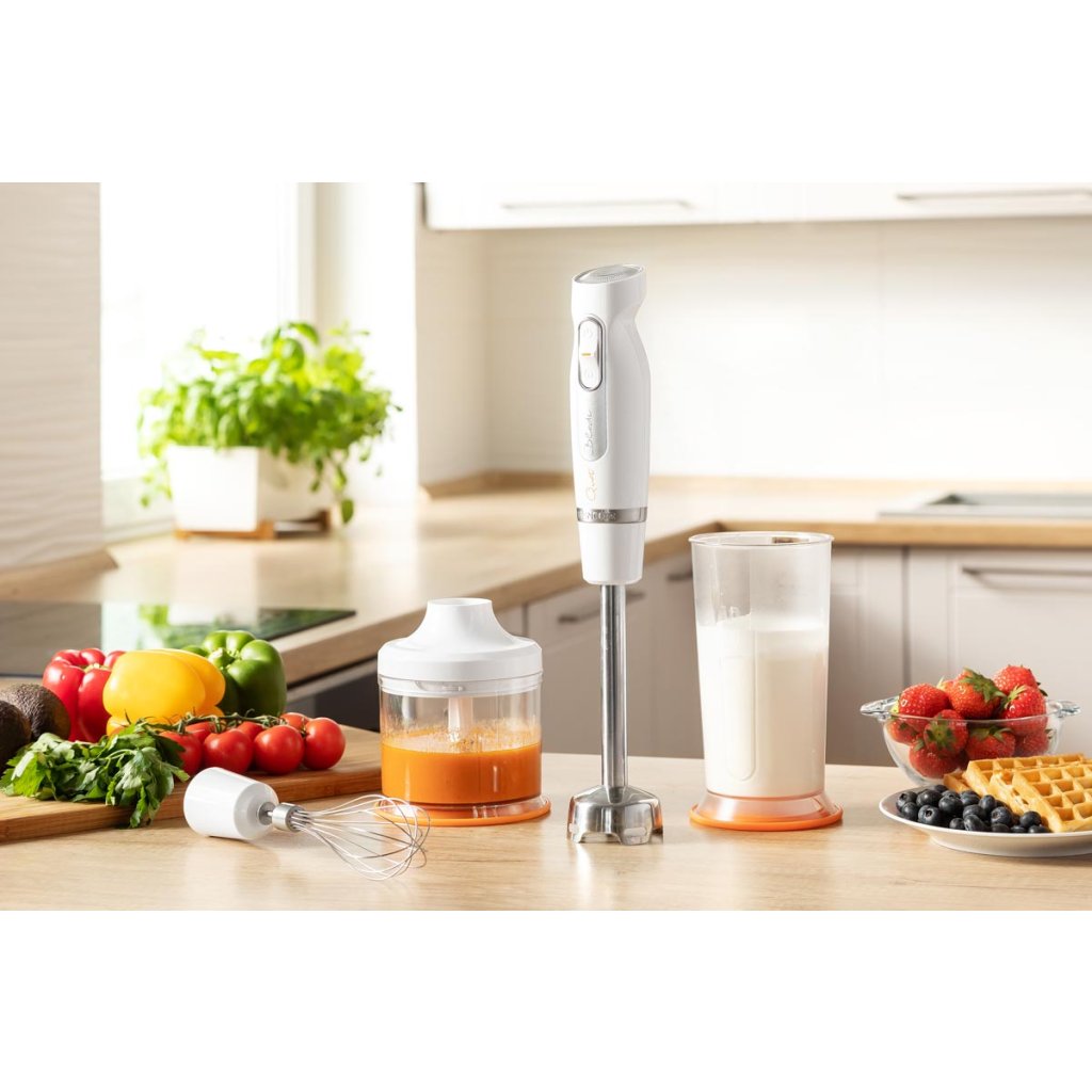 S ponorným mixérom Sencor SHB 4378WH môžete začať mixovať polievky, omáčky alebo dokonca smoothie. Vďaka priloženému sekáčiku môžete tiež sekať zeleninu, bylinky a orechy. Spotrebič dokáže tiež drviť ľad. Vyberte si z 2 rýchlostí a funkcie turbo, aby ste mixér v okamihu využili naplno. Ergonomicky tvarovaná rukoväť uľahčuje používanie. Tešiť sa môžete na veľmi tichý jednosmerný motor a 4 kvalitné nože z nehrdzavejúcej ocele. Okrem samotného ponorného mixéra je súčasťou balenia aj špeciálna 700 ml mixovacia nádoba. Mixér môžete používať aj s 500 ml nádobou. Praktická je aj priložená šľahacia metla, s ktorou sa môžete pustiť do šľahania rôznych krémov alebo vaječných bielkov. Príkon 800 W. Materiál: nerezová oceľ, plast. Rozmery: 12,3 x 12,3 x 33,1 cm.Dodatočné parametre
