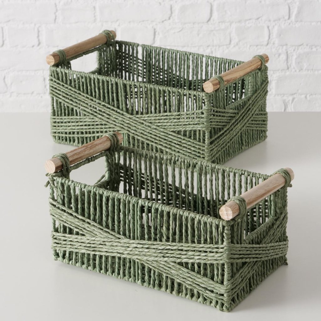 Praktická súprava 2 úložných košíkov s drevenými rukoväťami ponúka štýlové a funkčné riešenie na každodennú organizáciu domácnosti. Koše sú vyrobené z kombinácie papierovej a kovovej konštrukcie, vďaka čomu sú pevné, ľahké a zároveň dekoratívne. Drevené rukoväte uľahčujú prenášanie a dodávajú košíkom prirodzený vzhľad, ktorý sa dokonale hodí do moderných aj rustikálnych interiérov.