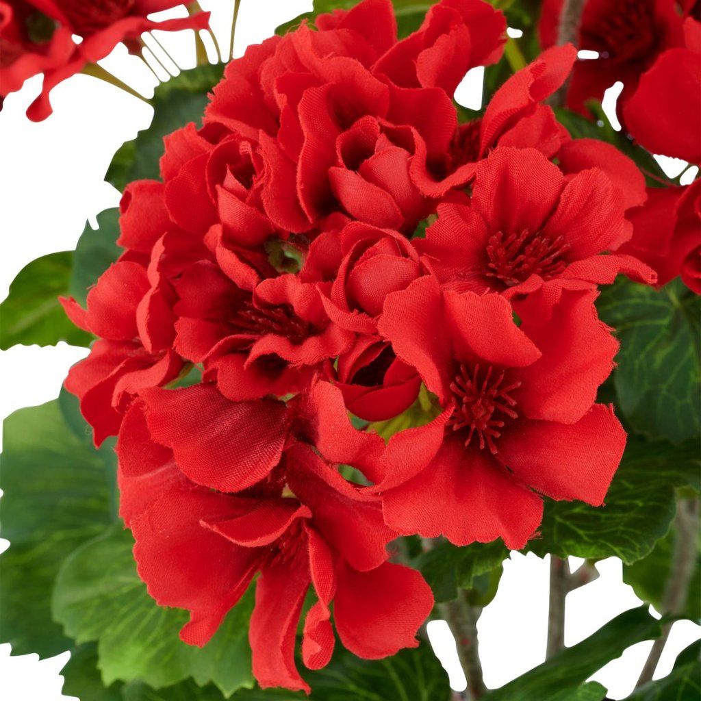 Táto červená pelargónia je realistická umelá rastlina s výškou 36 cm, ktorá prináša do priestoru svieži a prirodzený vzhľad kvitnúcich rastlín bez potreby starostlivosti. Jemné biele kvety vyzerajú ako elegantná dekoračná kvetina vhodná do interiéru alebo exteriéru.