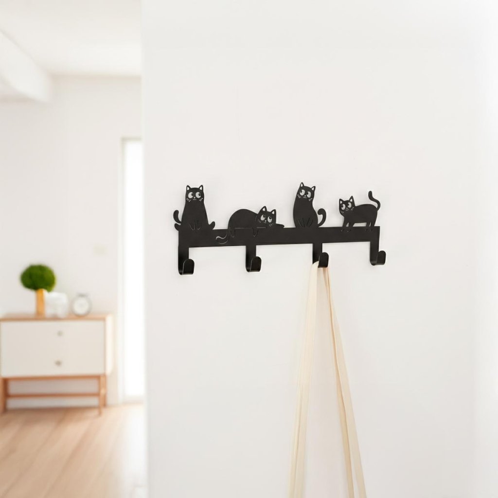 Tento stenový vešiak s motívom mačky je praktický a hravý doplnok, ktorý rozžiari chodbu, predsieň alebo detskú izbu. Dekoratívnu kovovú lištu zdobia roztomilé mačky. Ponúka niekoľko háčikov na zavesenie kabátov, tašiek a kľúčov a pomáha udržiavať priestor prehľadne usporiadaný.