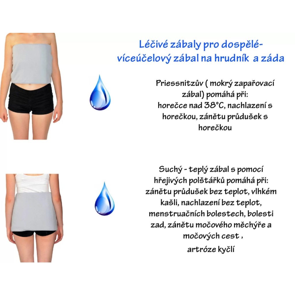 Pozitívny účinok Priessnitzových obkladov je známy už dve storočia a úspešne sa používa pri mnohých ochoreniach. Studený parný obklad sa aplikuje lokálne na postihnuté miesto s cieľom dosiahnuť zvýšené prekrvenie, ktoré urýchľuje hojivé procesy v tele. Viacúčelový Priessnitzov zábal pre deti a dospelých sa používa na zábal hrudníka a brucha. Ako mokrý naparovací obklad výrazne zmierňuje horúčku, prechladnutie a bronchitídu (zápal priedušiek). Všité posuvné popruhy veľmi dobre držia opasok na tele a umožňujú neobmedzený pohyb. Zábal možno použiť aj ako suchý a teplý zábal pri detskej brušnej kolike, prechladnutí bez teplôt, bronchitíde bez teplôt, zápale močového mechúra a močových ciest, bolestiach obličiek a vlhkom kašli.