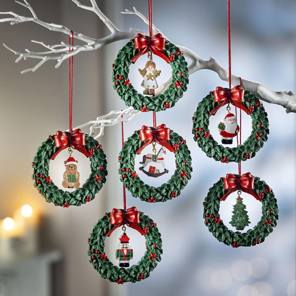 Tieto ozdoby na vianočný stromček sú malé, ale veľmi pôvabné! Každý veniec je ozdobený červenou slávnostnou stuhou. Vo vnútri sa hojdá roztomilá vianočná figúrka: anjelik, Mikuláš, medvedík, luskáčik na orechy, vianočný stromček a hojdací koník.
