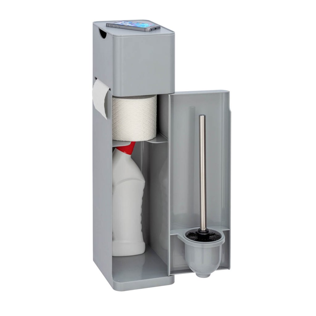 WC stojan kombinuje držiak toaletného papiera, kefy s držiakom, držiak na role a ďalší úložný priestor. K dispozícii sú ešte 2 priehradky: na dámske hygienické potreby a čistiace prostriedky.