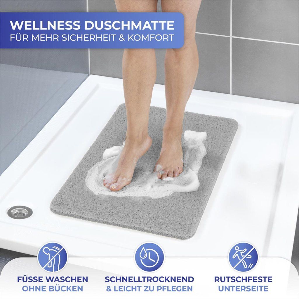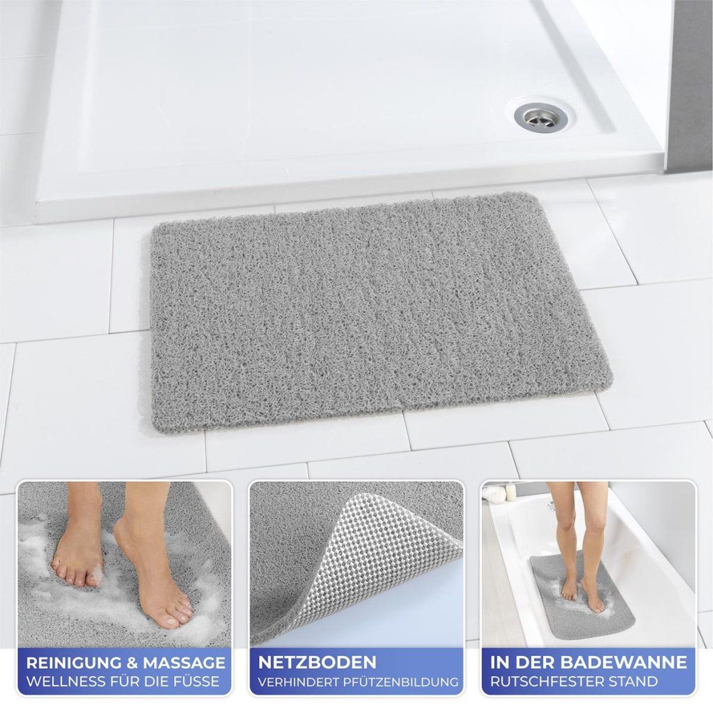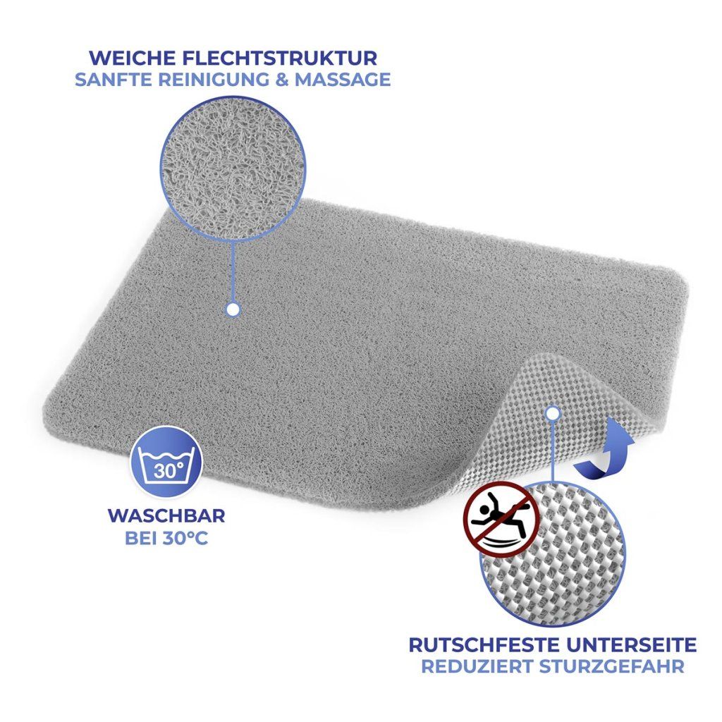 Podložka z protišmykovej sieťoviny zaisťuje stabilitu a umožňuje rýchly odtok vody, čím výrazne znižuje riziko pošmyknutia. Pri použití so sprchovacím gélom alebo mydlom vytvára mäkkú penu, ktorá zvyšuje pohodlie a prináša pocit domácej pohody.