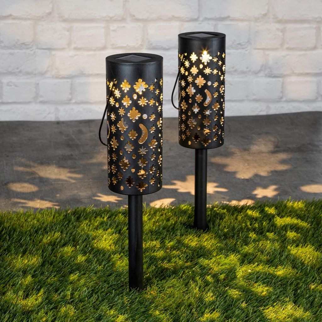 Sada 2 atraktívnych svietidiel s ažurovým dekoratívnym dizajnom vytvára na pozadí zasnený tieň. Každá s 1 LED diódou a integrovaným solárnym panelom sa počas dňa nabíjajú a po zotmení sa automaticky rozsvietia.