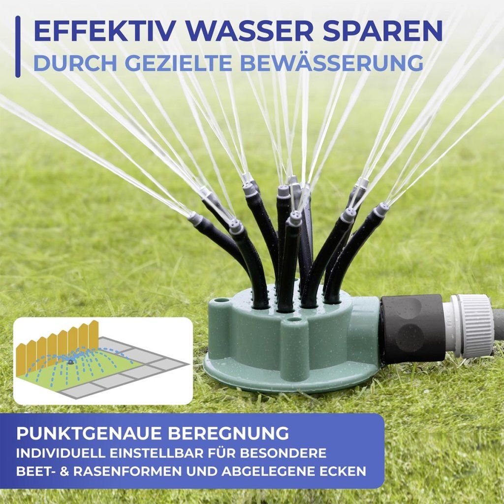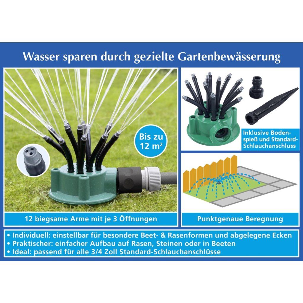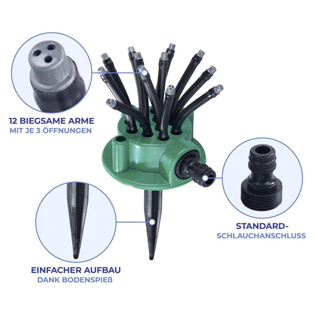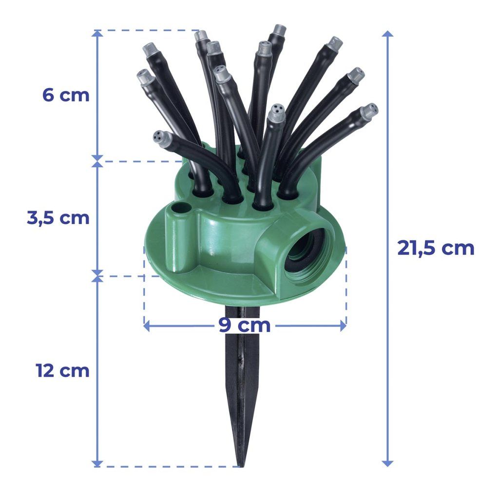 Praktický záhradný zavlažovač je ideálnym pomocníkom na pohodlné a efektívne zavlažovanie trávnikov, záhonov a záhrad. Je vybavený 12 flexibilnými ramenami, ktoré zabezpečujú rovnomerné rozdeľovanie vody a presné zavlažovanie bez plytvania. Jednoducho ho zapichnite do pôdy na mieste, ktoré potrebujete zaliať. Robustná plastová konštrukcia zaručuje dlhú životnosť pri správnom skladovaní mimo sezóny. Pripojenie je kompatibilné so štandardnou ¾-palcovou hadicovou spojkou.
