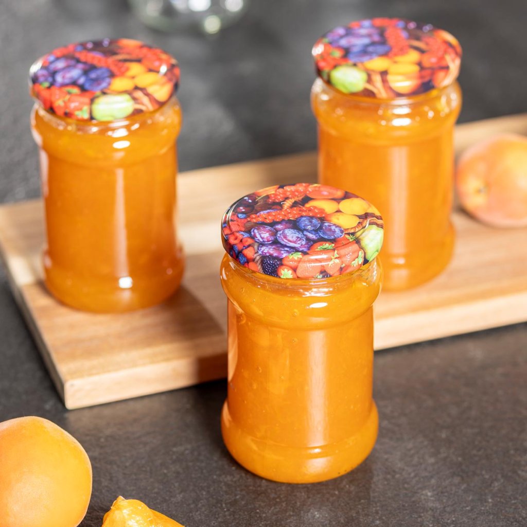 Sklenice s objemom 315 ml sú vyrobené z odolného skla a majú viečka s peknou potlačou ovocia.