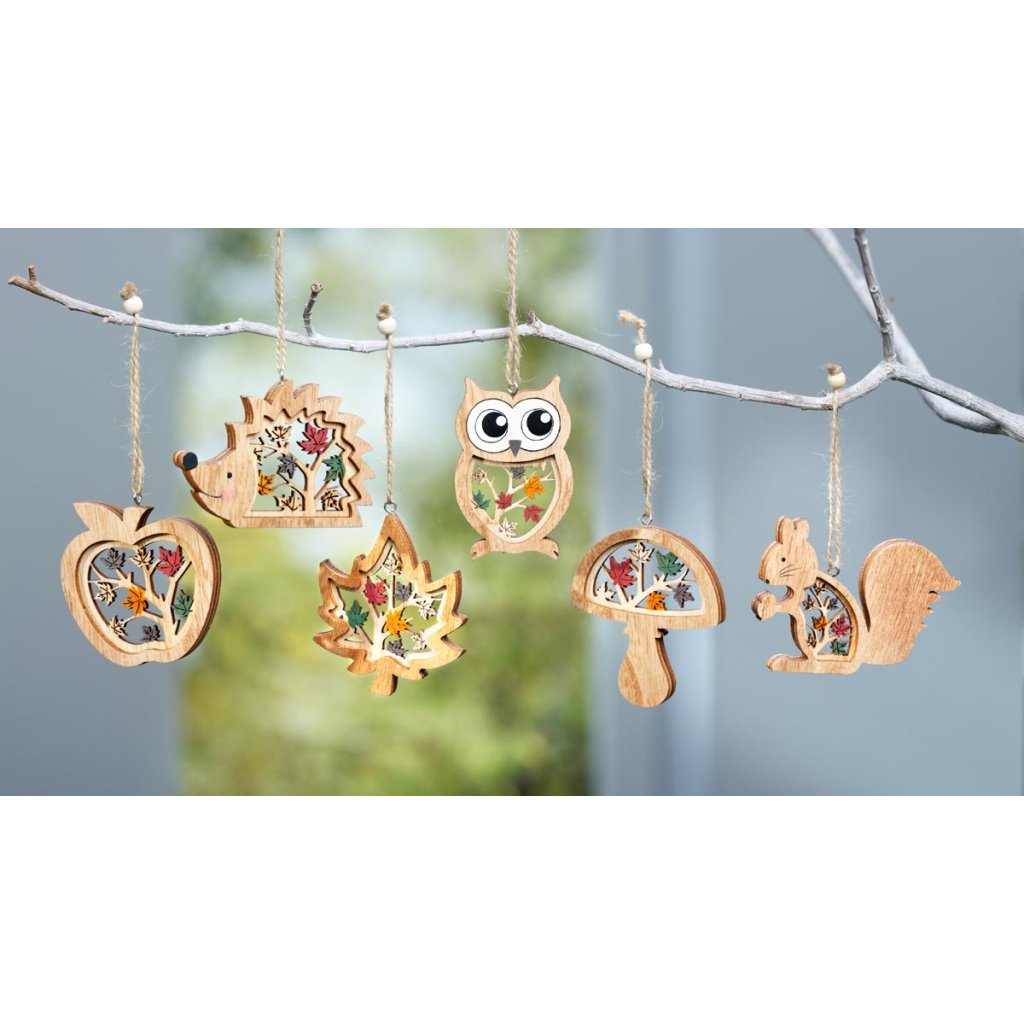 Šesť rôznych jesenných motívov na zavesenie sú detailne vyrezané a ručne maľované z oboch strán. Záves z jutovej šnúrky s drevenými korálkami. Ideálny na doplnenie jesennej dekorácie zo suchých prírodnín. Záves z jutovej šnúrky s drevenými korálkami.