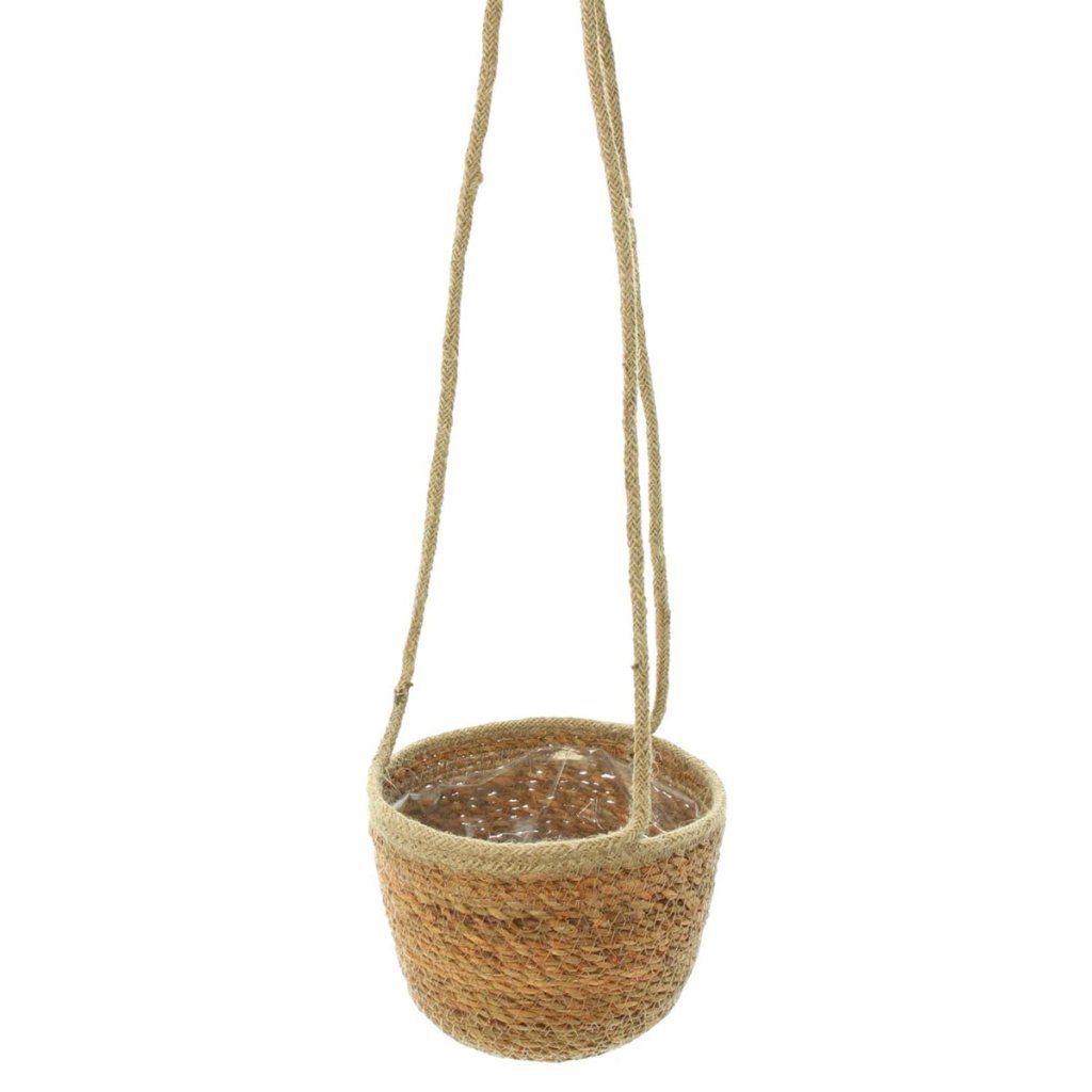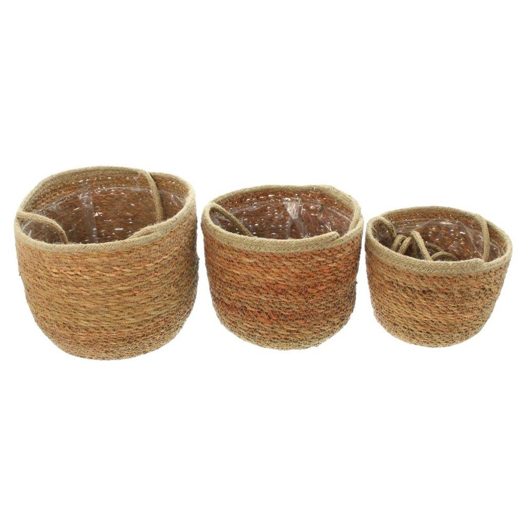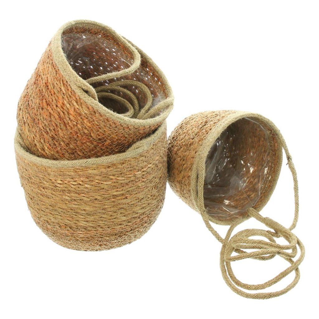 Táto štýlová sada troch závesných kvetináčov vnesie do vášho priestoru prírodný šarm a sviežu atmosféru. Každý kvetináč je vyrobený z farbenej seagrass a jeho vnútro je vystlané fóliou, ktorá zabraňuje presakovaniu vody.