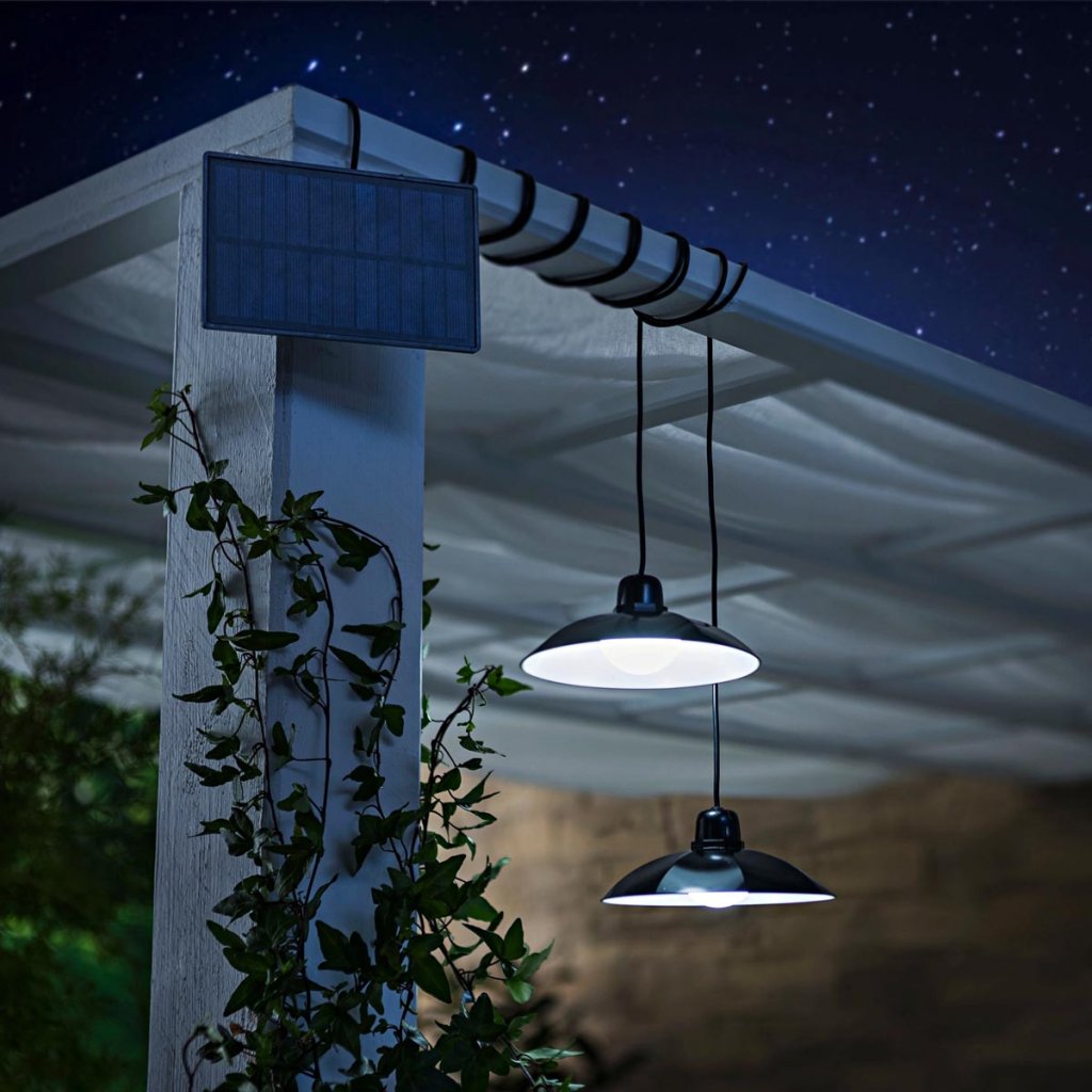 Solárne závesné svietidlo s 2 lampami prináša do záhrady, na balkón alebo terasu jasné akcenty a útulnú atmosféru. Skladá sa z odolného solárneho panelu a dvoch LED svetiel odolných voči poveternostným vplyvom.