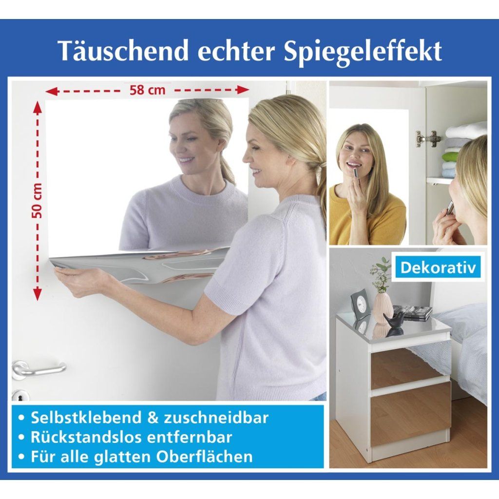 Fólia sa ľahko aplikuje na hladké povrchy, ako sú steny, nábytok alebo dvere, a vďaka svojej flexibilite sa dá prispôsobiť rôznym projektom. Je vyrobená z odolného plastu, ktorý zaručuje dlhú životnosť. Obraz je v porovnaní s bežným zrkadlom mierne skreslený, čo je typická vlastnosť tohto typu fólie.
